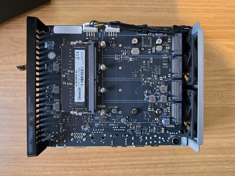 Pour accéder à l'intérieur du NAS afin d'installer les disques SSD NVMe, il n'y a qu'une seule vis à retirer. Cela permet de retirer la coque principale du boitier. Les emplacements pour SSD sont répartis de chaque côté de la carte mère. Chaque emplacement est numéroté, ce qui est un bon point afin de faire le lien entre l'emplacement physique et l'emplacement détecté dans l'OS de TerraMaster.