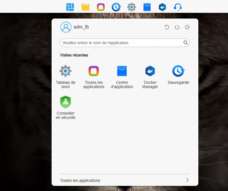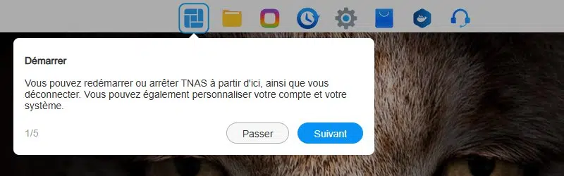 Lors de la première connexion, un assistant nous guide afin de nous expliquer l'utilité des différentes zones de l'interface. Le bureau virtuel intègre une barre des tâches, dans le même style que sur Windows, à la différence qu'elle se positionne en haut de la fenêtre (habituel sur les interfaces de NAS).