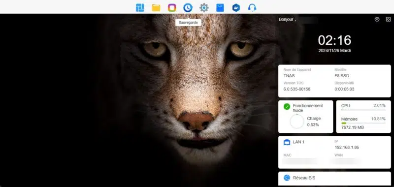 Un système de widget permet d'avoir accès à des informations sur l'état de santé du NAS grâce à un panneau latéral visible sur la droite. En un clin d'œil, il est possible de voir le nom de l'appareil, le modèle, la version du système, ainsi que des informations sur l'utilisation des ressources.