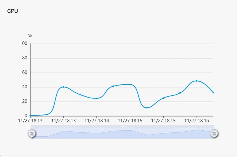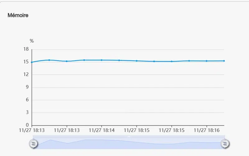 Pendant le benchmark basé sur un partage chiffré, j'ai également surveillé la charge RAM et la charge CPU. On peut constater que le transfert de fichier n'a pas un réel impact sur la RAM, car elle reste à 15% d'utilisation, tandis que le CPU ne dépasse pas les 50%.