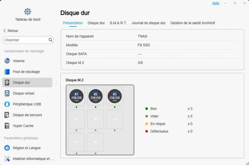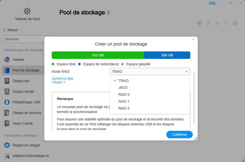 Sachez que ce modèle supporte plusieurs modes de stockage : TRAID, TRAID+, Single, JBOD, RAID 0, RAID 1, RAID5, RAID 6, et RAID 10. Ma configuration étant basée sur 3 disques, un volume TRAID monté en Btrfs est créé. Il est également possible de créer un cache SSD.