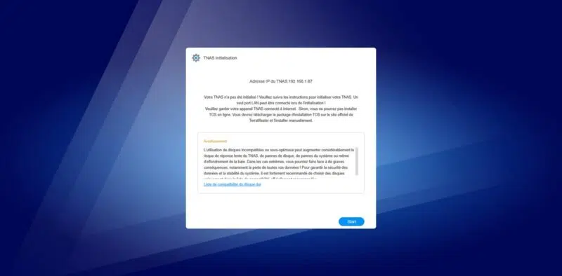 L'initialisation du NAS s'effectue à partir d'un ordinateur, via un simple navigateur. La mise en route s'effectue en quelques clics et c'est relativement rapide. Un assistant nous guide tout au long de la mise en route. Il est difficile de se tromper.