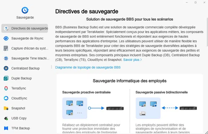TerraMaster a également développé la solution Business Backup Suite pour répondre aux besoins des entreprises et des particuliers en matière de sauvegarde. Sauvegarde sur le NAS, sauvegarde externalisée dans le Cloud, synchronisation des données de votre PC ou Mac vers le NAS, etc... De nombreux scénarios sont pris en charge. Vous pouvez consulter cette page pour en savoir plus.