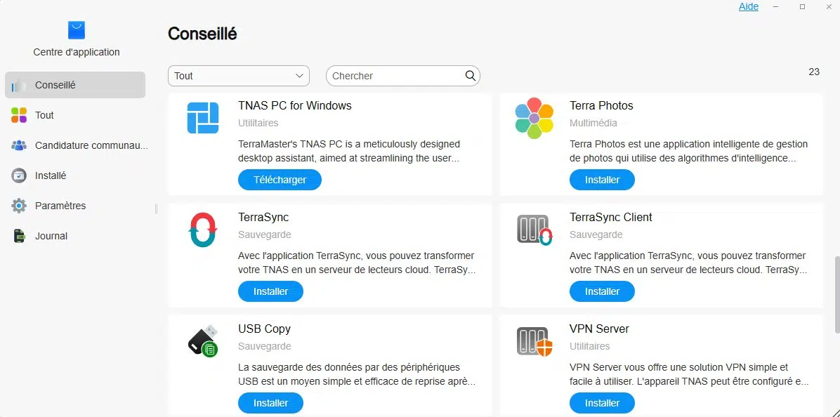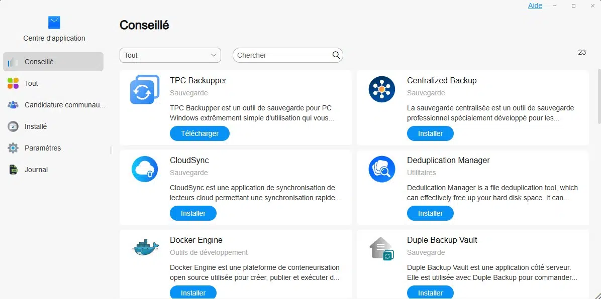 Le système TOS 6 est livré avec des applications et des services préinstallés, mais tout cela est évolutif grâce à un centre d'applications. L'utilisateur peut installer les paquets de son choix, en allant piocher dans un catalogue d'applications approuvées par la marque. Il y a également un site communautaire qui explique comment installer d'autres applications, y compris via des conteneurs Docker.