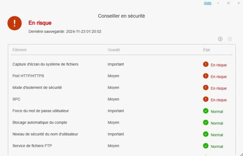 Le Conseiller en sécurité est un précieux allié qui guidera l'utilisateur dans la sécurisation de son NAS. En cliquant sur un élément, il est possible d'obtenir des informations supplémentaires. Par contre, la traduction est un peu hasardeuse par moment. Par exemple, le premier élément évoque la "Capture d'écran du système de fichiers", ce qui correspond à la configuration des clichés instantanés sur le volume Btrfs.