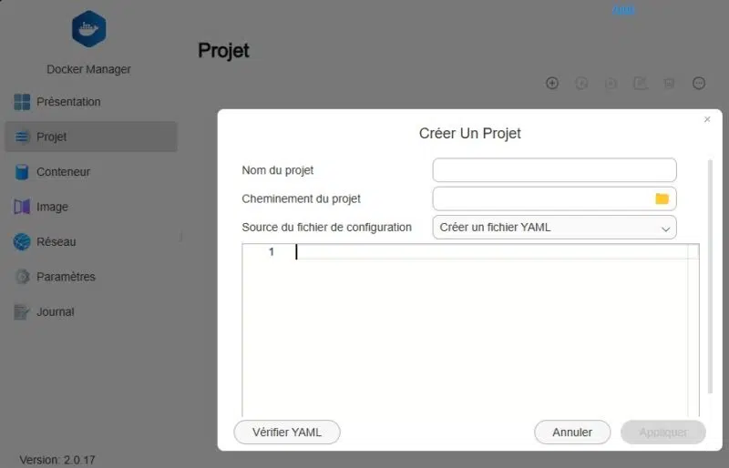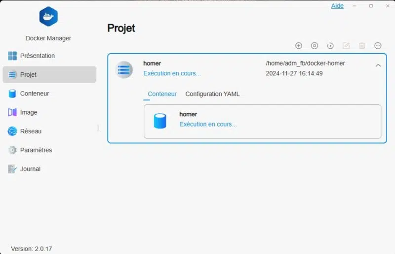 Vous pouvez faire tourner des conteneurs via Docker Manager, basé sur Docker. Il y a la possibilité de créer des conteneurs individuels et des projets basés sur des fichiers de configuration Docker Compose. Ceci est très pratique pour déployer facilement un ou plusieurs conteneurs.