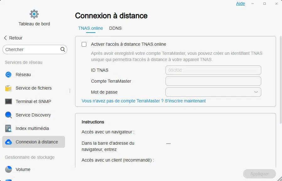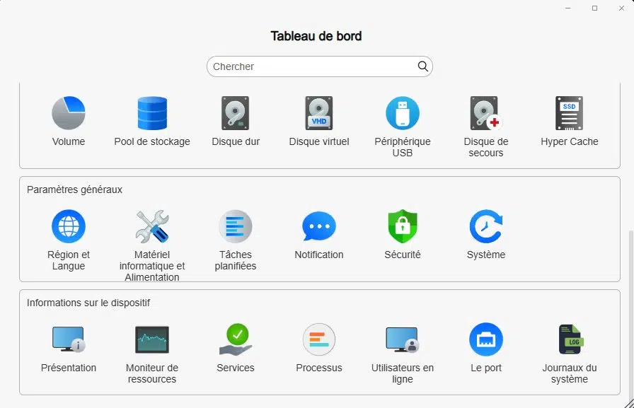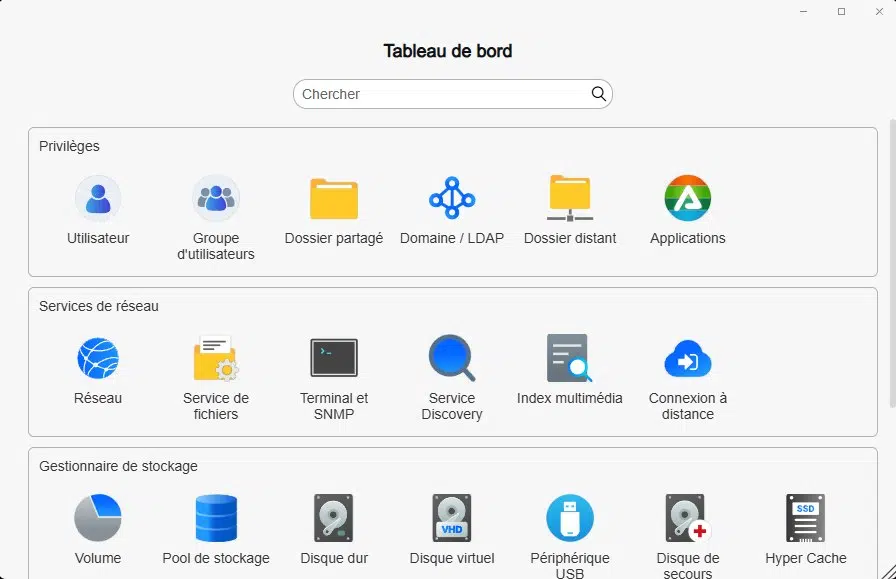 Le Tableau de bord donne accès à toutes les sections liées à la configuration du système, que ce soit pour le réseau, la sécurité, les répertoires partagés ou le stockage. Lorsqu'elle est activée, la fonctionnalité de Connexion à distance permet d'accéder à son NAS à distance, quand on n'est pas à son domicile.