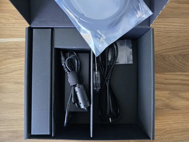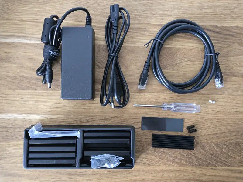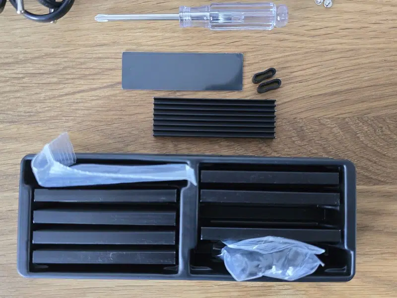 Le NAS est accompagné par son alimentation externe et le cordon d'alimentation, un câble RJ45 Ethernet, un tournevis et un kit de vis. Ce n'est pas tout, puisqu'il y a un pad de pâte thermique et un dissipateur thermique pour chaque disque SSD, soit 8 kits pour SSD. Cela favorisera la dissipation de la chaleur lorsque le NAS sera utilisé à plein régime.
