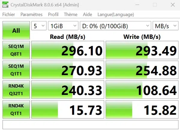 N'ayant pas de carte réseau Ethernet en 10 Gbit/s, les tests seront réalisés avec une connectivité 2.5 Gbit/s. Le NAS est équipé de 3 disques SSD NVMe de marque Maxio associé à un volume TRAID. Pour évaluer les performances, je vais m'appuyer sur des transferts de fichiers effectués par le réseau (via le protocole SMB) et des transferts via une cible iSCSI.