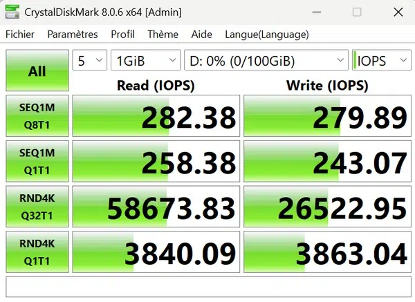 Les résultats ci-dessous correspondent à un benchmark effectué via CrystalDiskMark avec le LUN monté sur Windows en tant que cible iSCSI.
