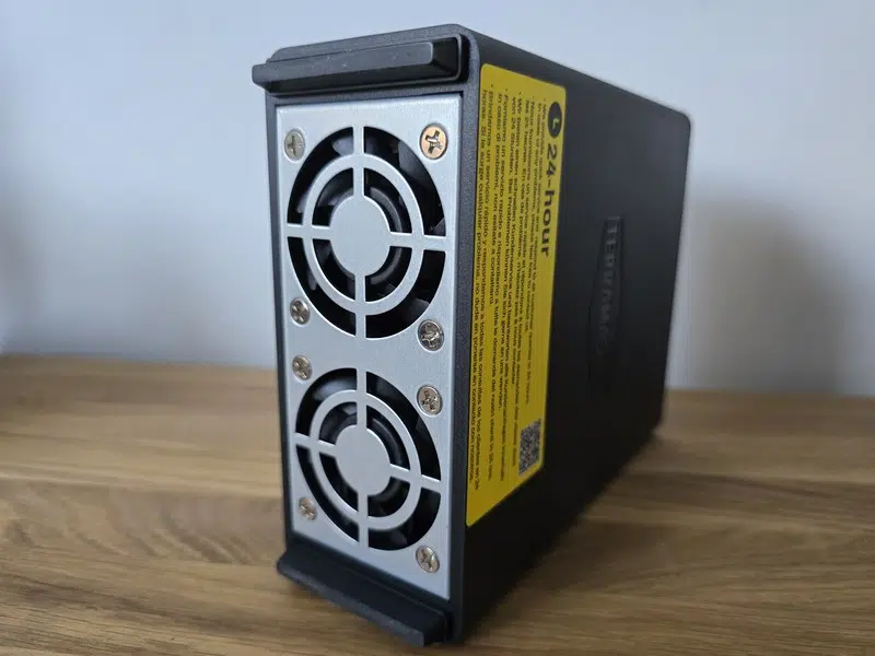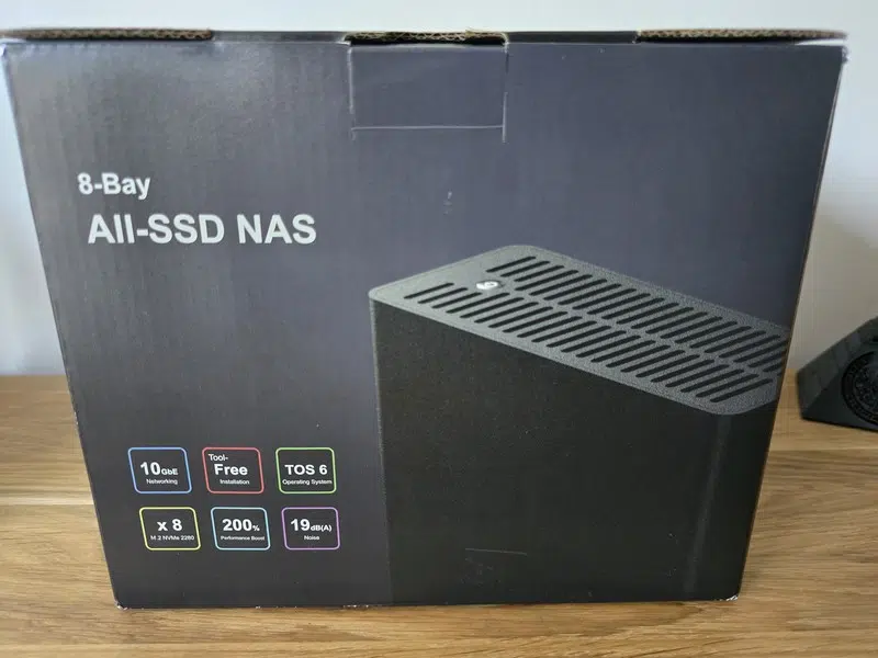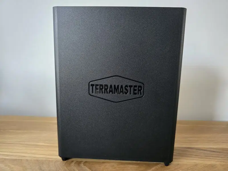 Entièrement noir, ce NAS est conçu pour être positionné debout, c'est-à-dire à la verticale. D'un point de vue de l'esthétique, TerraMaster a créé un boitier à la fois élégant et minimaliste : il saura s'intégrer aussi bien dans un bureau, dans une salle serveurs que dans un salon... Son format me rappelle celui des disques durs externes au format 3.5 pouces, qui appartiennent désormais à une autre époque. Sauf que là, nous avons un boitier avec 8 disques SSD, une carte mère et un système d'exploitation.
