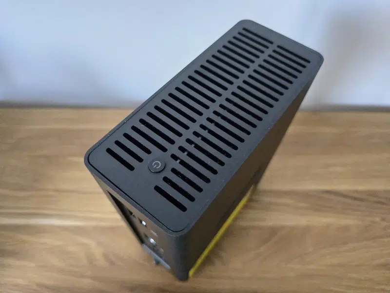 Le bouton d'alimentation se situe sur le dessus du boitier, ce dernier étant accompagné par l'aération principale du boitier. Indispensable pour l'extraction de l'air. Les deux ventilateurs de 50 mm quant à eux, sont situés sur le dessous du boitier, c'est donc par là que l'air rentrera. Contrairement aux autres NAS de chez TerraMaster, ce nouveau F8 SSD n'a pas de voyants d'état en façade, que ce soit pour les disques ou le réseau. C'est dommage, mais cela élimine toute distraction visuelle éventuelle. La seule LED du boitier se situe au niveau du bouton d'alimentation.