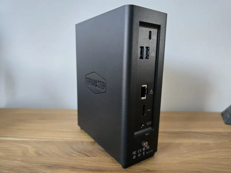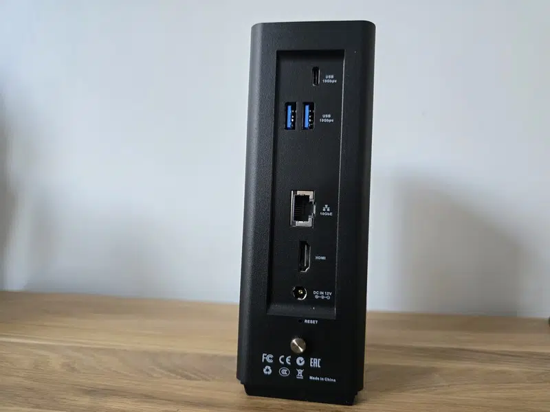 Désormais, évoquons la connectique de ce NAS. Tout d'abord, sachez que tous les ports sont situés à l'arrière du boitier. Les 2 ports USB-A et le port USB-C sont situés en haut du boitier tout en étant à l'arrière. Ils sont accompagnés par l'interface 10 GbE, le port HDMI 2.0b, ainsi que le port d'alimentation.