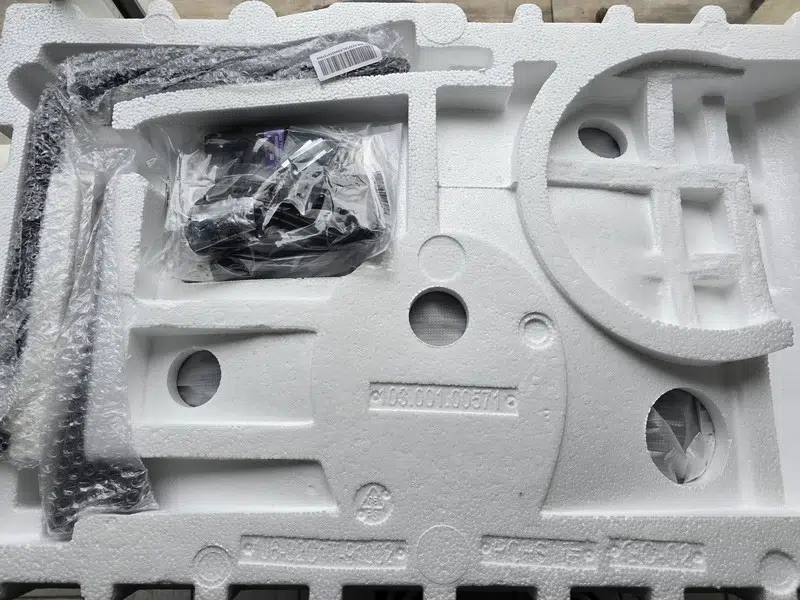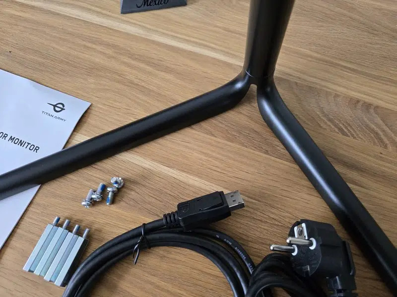 Le carton dans lequel se situe l'écran est sobre, avec uniquement un marquage propre à la marque Titan Army. Mais, soyons honnêtes, le plus intéressant se situe à l'intérieur de cette mystérieuse boite... L'écran est enfermé dans une boite en polystyrène tandis que les accessoires sont à l'arrière, séparés et enfermés grâce au fait qu'il y a comme des compartiments dans le polystyrène. Tout est parfaitement protégé et chaque élément est à sa place. Résultat, le matériel est livré en parfait état.
