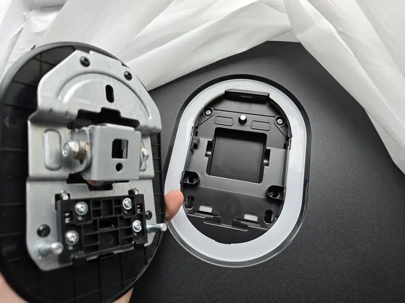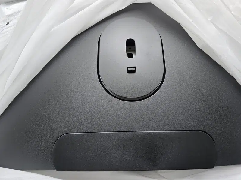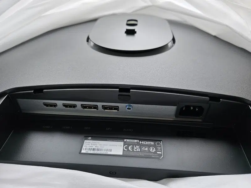 La connectique se situe à l'arrière de l'écran et elle est quasiment centrée. Il y a bien les 2 ports HDMI, les 2 ports DisplayPort et le port Jack pour l'audio promis par la fiche technique. Une place en plastique améliore l'esthétique de l'écran, en plus de masquer la connectique (voir sur la photo plus loin dans l'article). Quand elle est retirée, elle permet d'accéder facilement aux ports. Cet écran n'a pas de port USB.