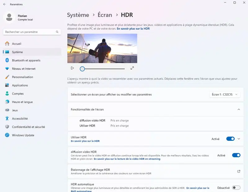 La présence de 4 ports offre également une certaine flexibilité, ce qui intéressera davantage les personnes qui ont pour objectif d'utiliser un seul pour différents équipements (PC, console, etc.). Ainsi, le passage de la console au PC est assez simple... Un changement de source est suffisant. Sous Windows 11, là encore, nous pouvons profiter du HDR et d'une résolution de 2560 x 1440 (au maximum). Côté HDR, vous pouvez utiliser le mode automatique pour upgrader certains jeux.