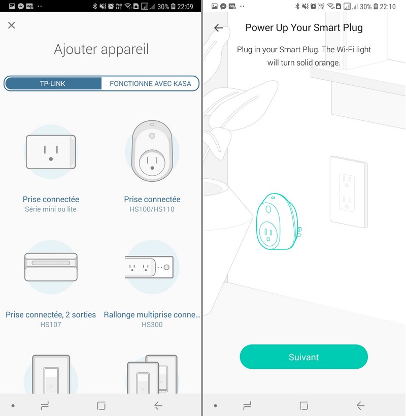 En appuyant sur le "+" en haut à droite de l'application, on peut ajouter un nouvel appareil. Il faut ensuite choisir "Prise connectée HS100/HS110" et connecter l'appareil sur une prise murale.