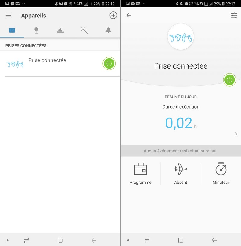 L'appareil apparaît désormais dans la liste et son état s'affiche, quand c'est vert bien entendu c'est que c'est allumé/actif. Si l'on sélectionne cet appareil, on peut voir le détail avec notamment le temps d'exécution, vous n'aurez pas la consommation comme ce n'est pas supporté par ce modèle.