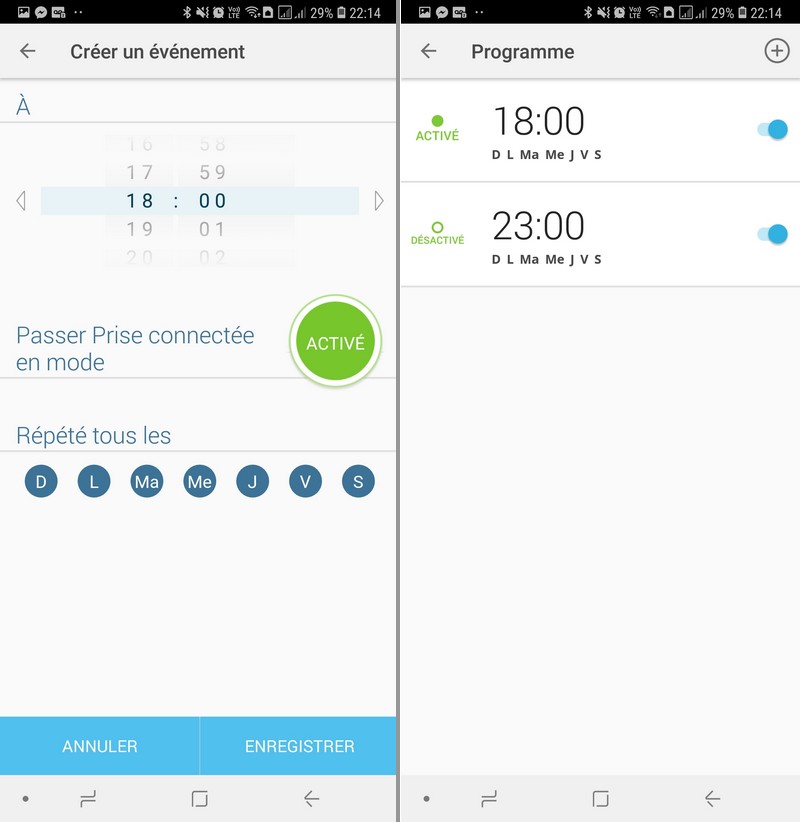 Si l'on rentre dans le détail de la fonction "Programme", on peut créer des événements pour activer ou désactiver la prise connectée. Cet ensemble d'événements va vous permettre de créer un programme. Ce qui peut donner :