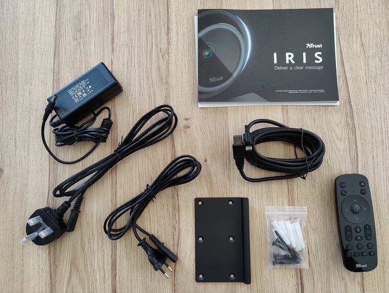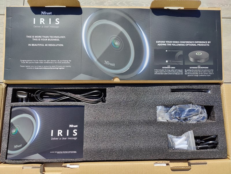 La caméra IRIS se présente sous la forme d'une barre de son (d'apparence seulement) avec une caméra motorisée au centre, le tout pour 60 cm de large. Un guide de démarrage rapide est également fourni. Il explique comment connecter la caméra à son PC et comment utiliser la télécommande.