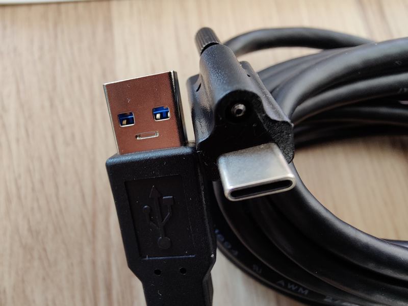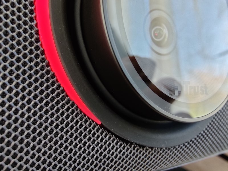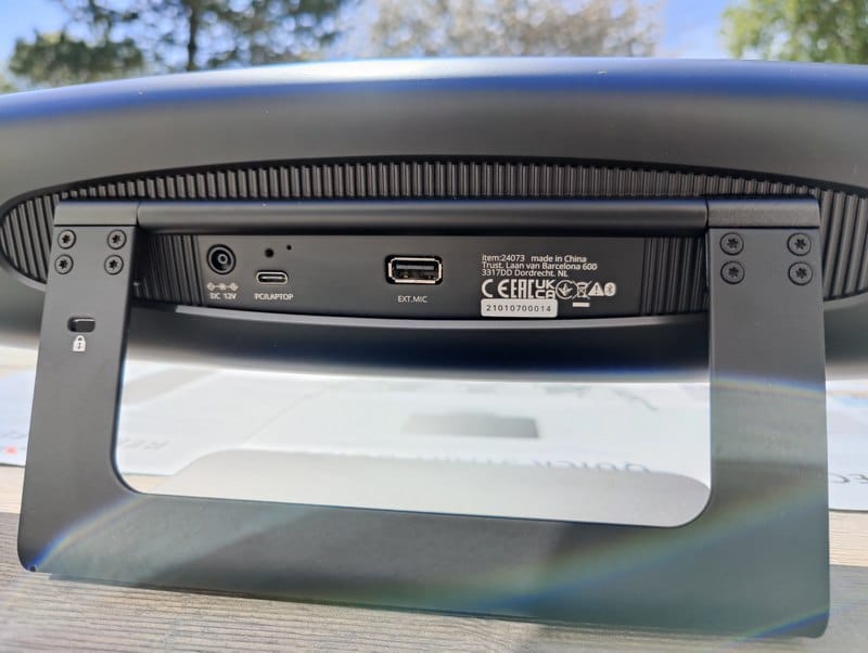 À l'arrière, nous pouvons jeter un coup d'oeil à la connectique. Nous avons le droit à un connecteur pour l'alimentation, un connecteur USB-C pour la connexion avec l'ordinateur et un port USB-A qui sert à connecter un éventuel micro additionnel. La caméra est conçue pour capter le son des utilisateurs jusqu'à 5 mètres de distance. Ensuite, il est préférable d'opter pour un micro externe : cela tombe bien, Trust en propose un en option. Il n'y a pas de bouton on/off sur la caméra en elle-même, mais il n'y a pas de LED active lorsqu'elle est branchée électriquement sans être connecté en USB donc c'est tant mieux.