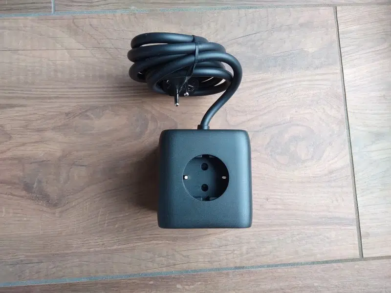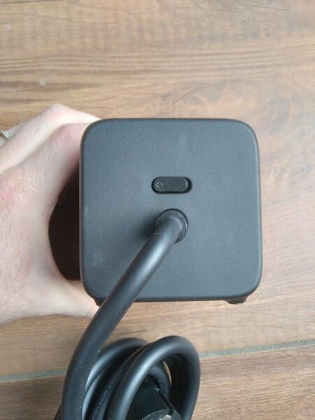 Regardons de plus près le design de notre Cube. Les trois prises de courant sont réparties sur les faces noires (les côtés et sur le dessus), tandis que les ports USB-A et USB-C sont sur la face avant qui est grise. Sur cette même face, on retrouve un voyant LED blanc (un peu trop discret) qui indique si la multiprise est sous tension. Les couleurs sont sobres, ce qui convient bien pour un bureau. À l’arrière, nous avons le câble d’alimentation (1,8m) du cube accompagné d’un interrupteur bien pratique.
