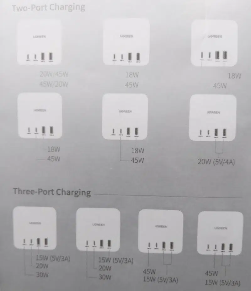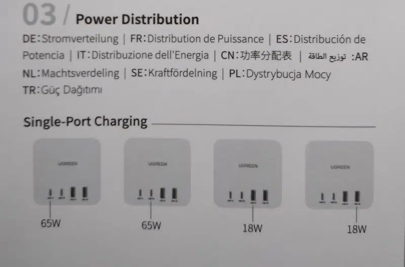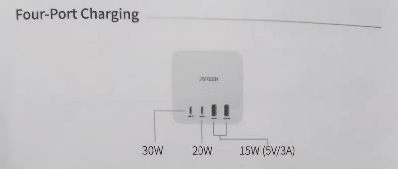 Concernant la répartition de puissance entre les différents ports USB, elle se fait automatiquement en fonction du nombre d’équipements que vous connectez. Un Schéma étant plus parlant que du texte, je vous présente en image le fonctionnement de cette répartition (image extraite du manuel utilisateur) :