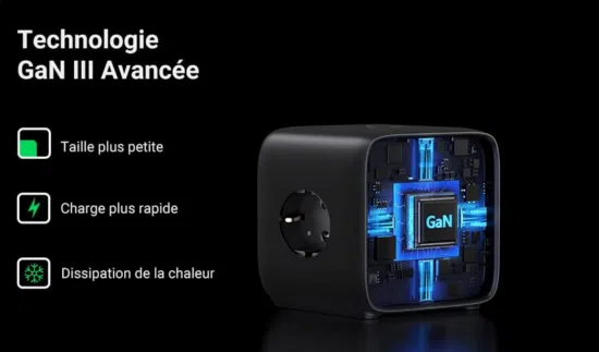 Tout ça dans un Cube compact qui est facilement transportable, vous pourrez l'emmener partout avec vous. Point intéressant également, il chauffe très peu, même au bout d'une journée d'utilisation. La dissipation thermique est optimisée grâce à la technologie GaN.