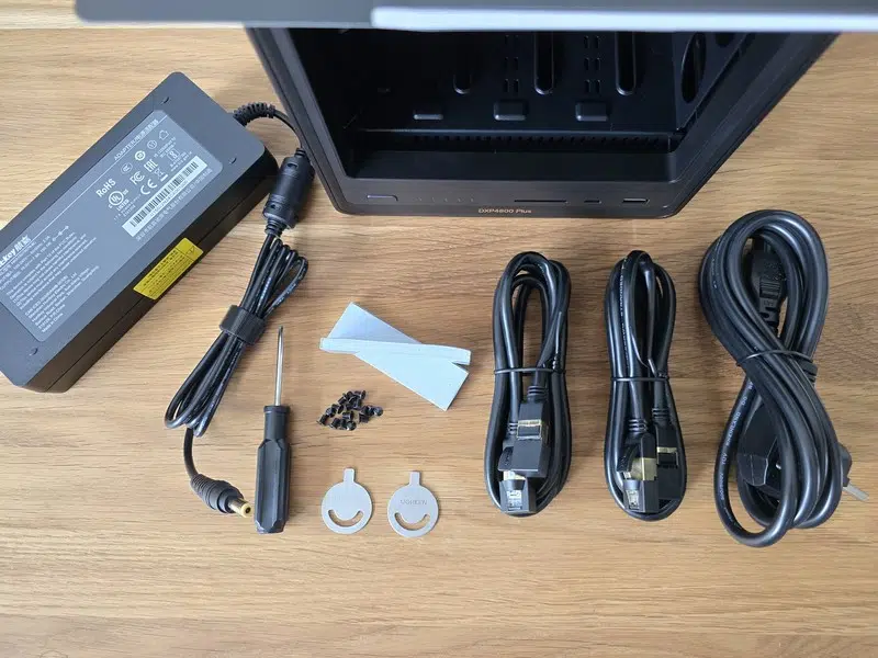Pour les accessoires, UGREEN nous propose du "all-inclusive", à l'exception des disques ! Je dis ça parce qu'il y a même un tournevis qui sera utile pour ceux qui veulent ajouter un disque SSD M.2. En résumé, nous avons les éléments suivants : un tournevis, un lot de vis, 2 pads pour les disques SSD (dissipation), 2 câbles RJ45 de Catégorie 7, une alimentation externe et son câble, ainsi que 2 accessoires faisant office de clé pour verrouiller et déverrouiller les baies de disque.