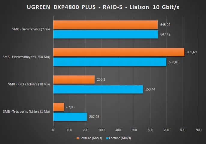Le test de débit ci-dessous a été réalisé via une connexion SMB, en 10 GbE. En 10 GbE, le bénéfice est surtout sur les opérations avec des gros blocs de données. Aussi, il est important de rappeler qu'avec le RAID-5, les opérations de lecture sont optimisées, mais les opérations d'écriture sont pénalisées par le calcul de la parité.