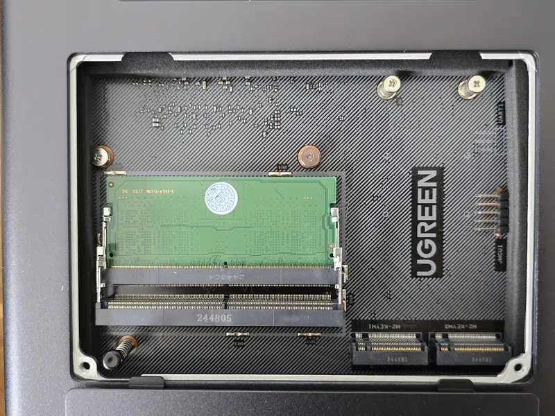 Pour le moment, nous n'avons pas de trace des slots pour ajouter des disques SSD M.2... Où sont-ils ? La réponse se situe sous le boitier. L'occasion de constater la présence de 4 patins antidérapants. Il y a une trappe à ouvrir après avoir retiré 2 vis et qui donne un accès direct aux entrailles du NAS. Il est possible d'ajouter une barrette de RAM, car un slot est disponible, et nous pouvons également visualiser les 2 slots pour SSD M.2. Une barrette de RAM Samsung de 8 Go est livré avec le NAS !