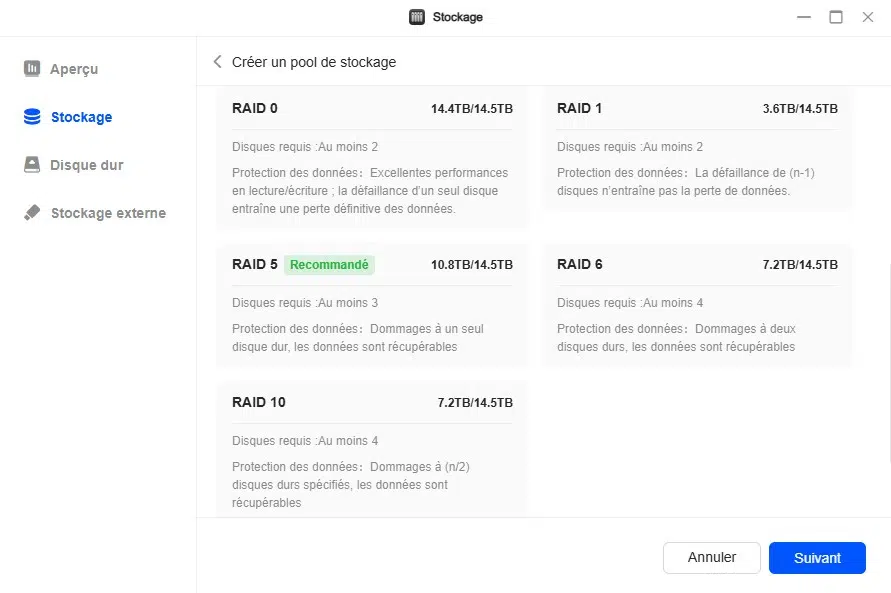 Pour cette série de tests, nous utiliserons une configuration adaptée pour la production : 4 x Seagate IronWolf Pro 4 To montés en RAID-5. Avec 4 disques, il offre un bon compromis entre performance et sécurité, puisque la panne d'un disque n'engendre pas une perte des données. Nous pourrions aussi partir sur un RAID-10, même si cela influencera la capacité utile.