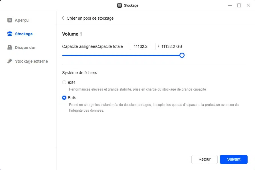 Néanmoins, il manque des petites options, qui ne sont que des détails, mais qui génèrent de la frustration lorsque l'on sait ce qu'il se fait chez la concurrence. On se dit que c'est dommage que ce ne soit pas implémenté : parfois, c'est une question de semaine, en attendant la prochaine mise à jour. Par exemple, le système de fichiers Btrfs est pris en charge, mais il n'est pas possible de créer des clichés instantanés. Il n'est pas non plus possible de créer un LUN que l'on va monter en tant que cible iSCSI depuis un autre équipement : ceci peut être bloquant pour les professionnels.