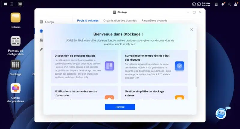 Un assistant est intégré à l'interface Web et nous propose une première découverte de l'interface. Il nous amène notamment dans le gestionnaire de stockage pour que l'on crée notre volume.