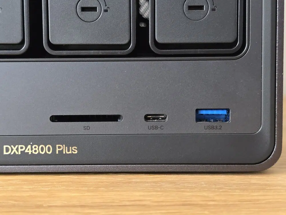 Note : le port USB-C peut être utilisé pour connecter un disque externe ou pour disposer d'une interface réseau supplémentaire. J'ai eu l'occasion de tester avec un adapteur réseau 2.5 GbE connecté en USB-C sur la façade du NAS.
