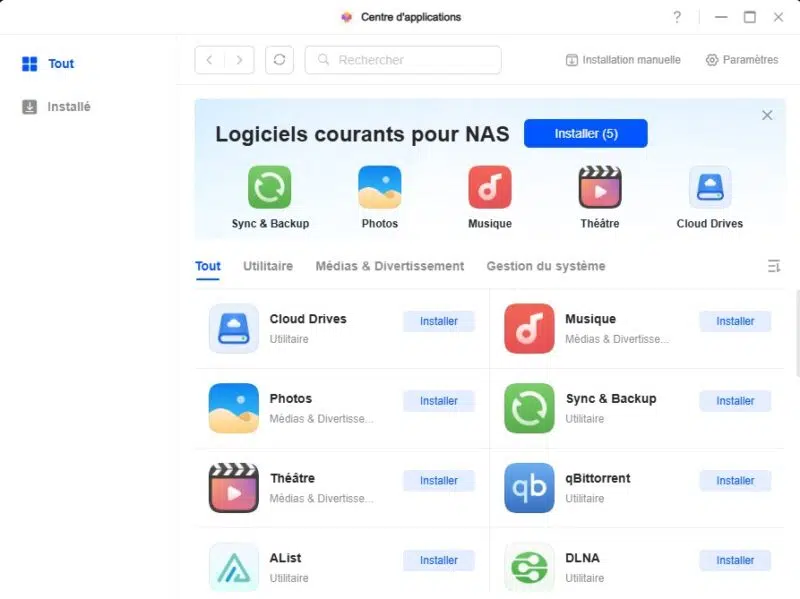 Sur un NAS, le magasin d'applications joue un rôle essentiel puisqu'il doit permettre à l'utilisateur d'étendre les fonctionnalités du boitier grâce à l'installation de paquets additionnels. Dans cette logique, UGOS PRO intègre le Centre d'applications. Il contient une vingtaine de paquets, y compris des applications développées par UGREEN. Nous retrouvons notamment :