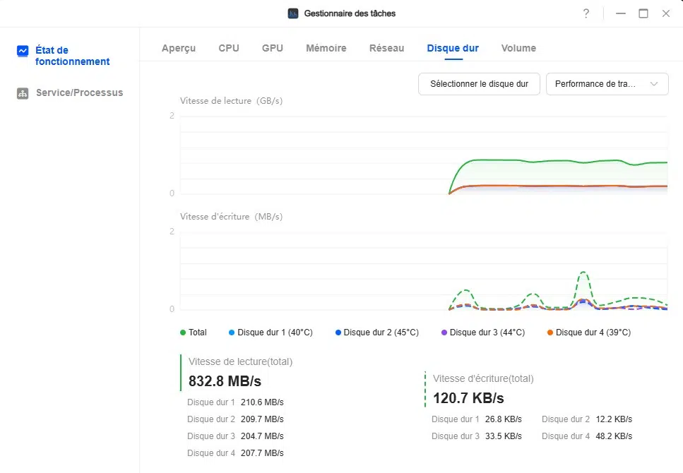 Le système UGOS PRO prend en charge plusieurs types de RAID, en fonction du nombre de disques insérés dans le NAS. Ici, nous partirons sur un volume en RAID-5 pour effectuer les premiers tests. Actuellement, UGREEN ne propose pas son propre système RAID comme peut le faire Synology avec le SHR. Le RAID a nécessité plusieurs heures pour s'initialiser, donc pendant ce temps, il n'était pas possible d'utiliser le volume.