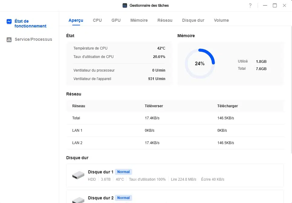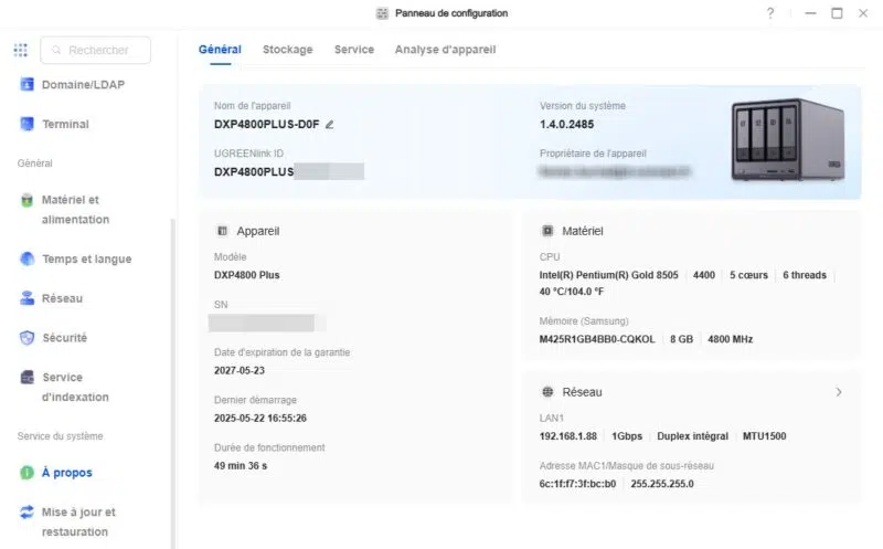 - Gestion du matériel : configuration du ventilateur, des LED ou encore du buzzer (raison pour lesquelles le NAS bip)
