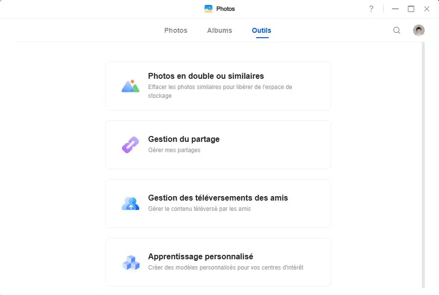 - Photos pour stocker et organiser des photos, y compris via des albums et l'identification des personnes. L'IA est utilisée pour créer automatiquement des albums pertinents.