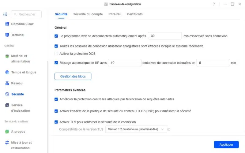 - Choix des versions TLS autorisées pour les accès Web en HTTPS