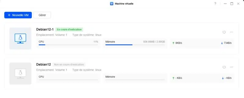 - Machine virtuelle pour créer des machines virtuelles, notamment sous Linux ou Windows. Il est également possible d'importer des machines virtuelles existantes, soit via un fichier OVA, ou via une image disque (IMG, VMDK, VDI, QCOW2).