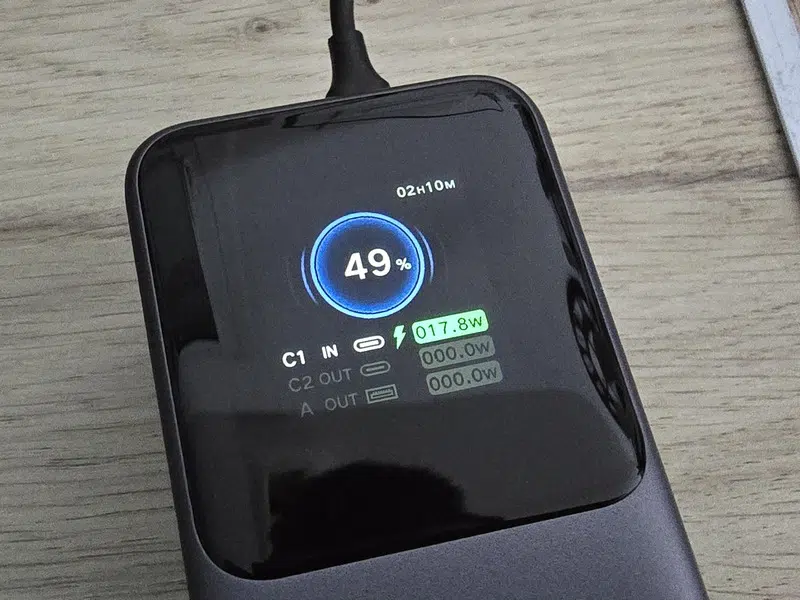 Lorsque la batterie est elle-même en cours de chargement, l'écran digital indique le pourcentage actuel de batterie. Il indique aussi une estimation du temps restant avant que la batterie soit complétement chargée. Ce n'est pas tout puisque nous pouvons voir quel est le port utilisé et visualiser la puissance en temps réel. Autant de précision sur une batterie externe, c'est appréciable. L'affichage intelligent présent sur cette batterie externe n'est pas une exclusivité liée à UGREEN, car certains concurrents ont aussi eu cette idée.