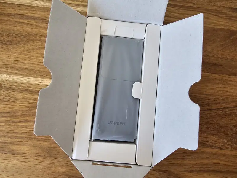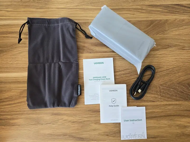 À l'intérieur de cette boite cartonnée, la batterie est emballée dans un plastique et elle est bien calée. Elle est correctement protégée. Elle n'est pas seule puisque UGREEN a également ajouté un manuel d'utilisation, un câble USB-C vers USB-C, ainsi qu'une housse de transport. C'est appréciable, car nous pourrons transporter la batterie et son câble sereinement.
