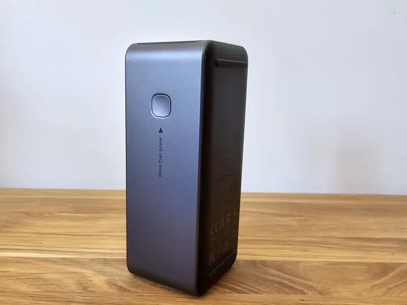 UGREEN a apporté un soin particulier au design de cette batterie, reprenant les couleurs habituelles de sa gamme. La batterie est grise, avec de sympathiques reflets. Son écran brillant incurvé suit parfaitement les courbes de la batterie. Lorsque la batterie se tient debout, à la verticale donc, les ports USB sont situés sur le dessus. Lorsqu'elle est à plat, la batterie externe sera stable grâce à deux patins anti-dérapant.