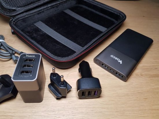 Elle contient une batterie externe de 10 000 mAh et son câble microUSB, un chargeur allume-cigare avec 3 ports USB, ainsi qu'un chargeur mural avec 3 ports et deux adaptateurs secteurs (UE et UK).