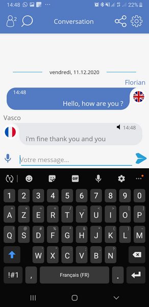 Sur les images ci-dessous, vous pouvez voir dans la pratique l'application MultiTalk, où la conversation est la même. Un participant est en français, l'autre en anglais. Chacun voit le texte dans sa langue, sans se rendre compte que c'est traduit.