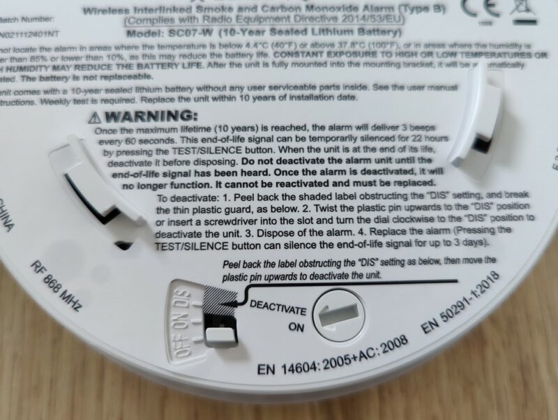 Lorsque l'on reçoit les détecteurs, ils ne sont pas activés. Pour effectuer la mise en service, il faut passer le taquet à l'arrière de "OFF" à "ON". Cette action est irréversible, tout comme le passage sur "DIS" pour "Disable". En fait, lorsque le produit sera en fin de vie, il faudra le désactiver en mettant le taquet sur la position "DIS" à l'aide d'un tournevis plat. Cette action va permettre de le désactiver définitivement : j'ai testé, car c'est mon rôle, et je vous confirme que le détecteur est inutilisable même s'il est neuf. Une erreur à ne pas commettre de votre côté.
