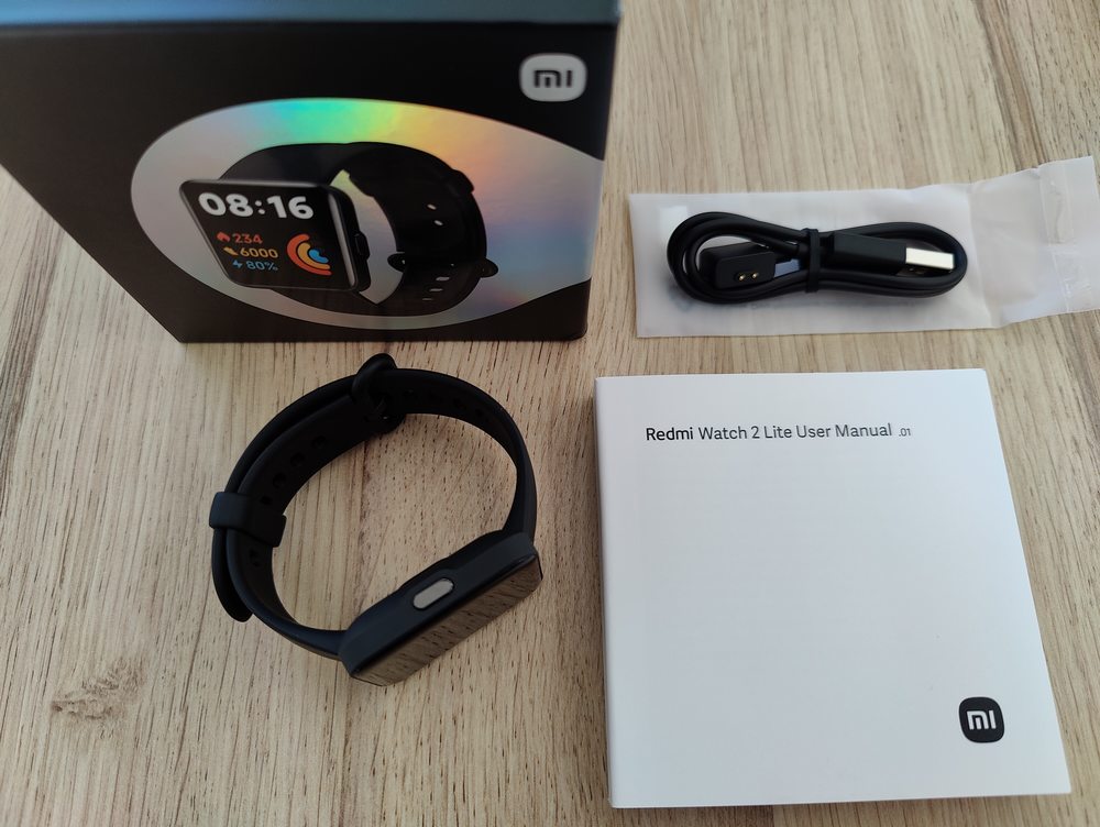 Comme vous pouvez le voir sur les photos ci-dessous, j'ai eu l'occasion de tester la version noire de la Redmi Watch 2 Lite. Elle est emballée dans une jolie boîte Xiaomi, dans laquelle on retrouve un guide utilisateur et le câble USB du chargeur magnétique.