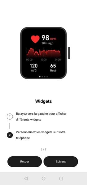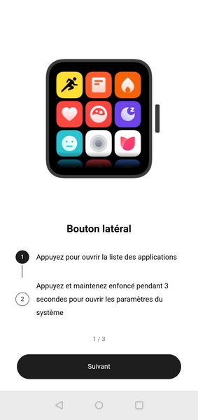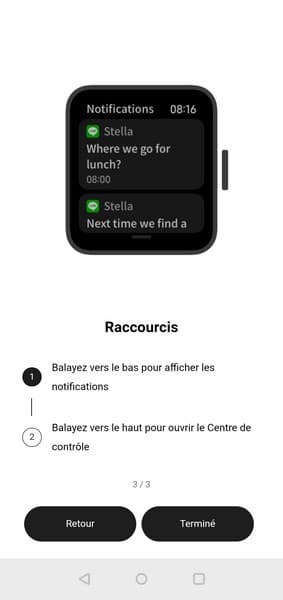 Suite à l'ajout, un assistant s'exécute afin de vous expliquer comment interagir avec la montre, soit à l'aide de l'écran tactile ou du bouton positionné sur le côté droit de la montre. C'est appréciable afin de mieux comprendre comment fonctionner le système de la montre. L'application donne accès à diverses fonctionnalités, sur lesquelles je vais revenir, ainsi que la possibilité de modifier le cadran.