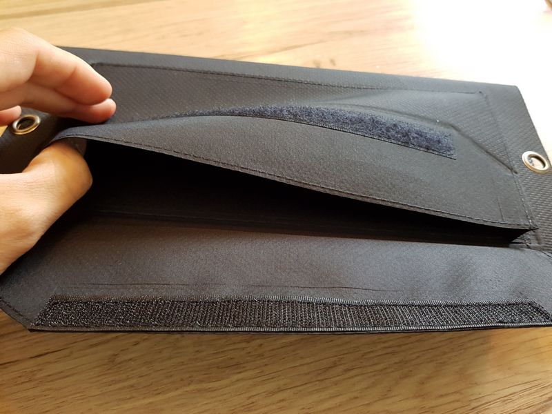 Le produit est assez imposant, ce qui est lié directement à la taille des cellules pour les panneaux solaires, mais il est par contre relativement léger : 315 grammes. Pour mieux vous rendre compte, déplié, il est légèrement plus grand que la taille de deux feuilles A4.